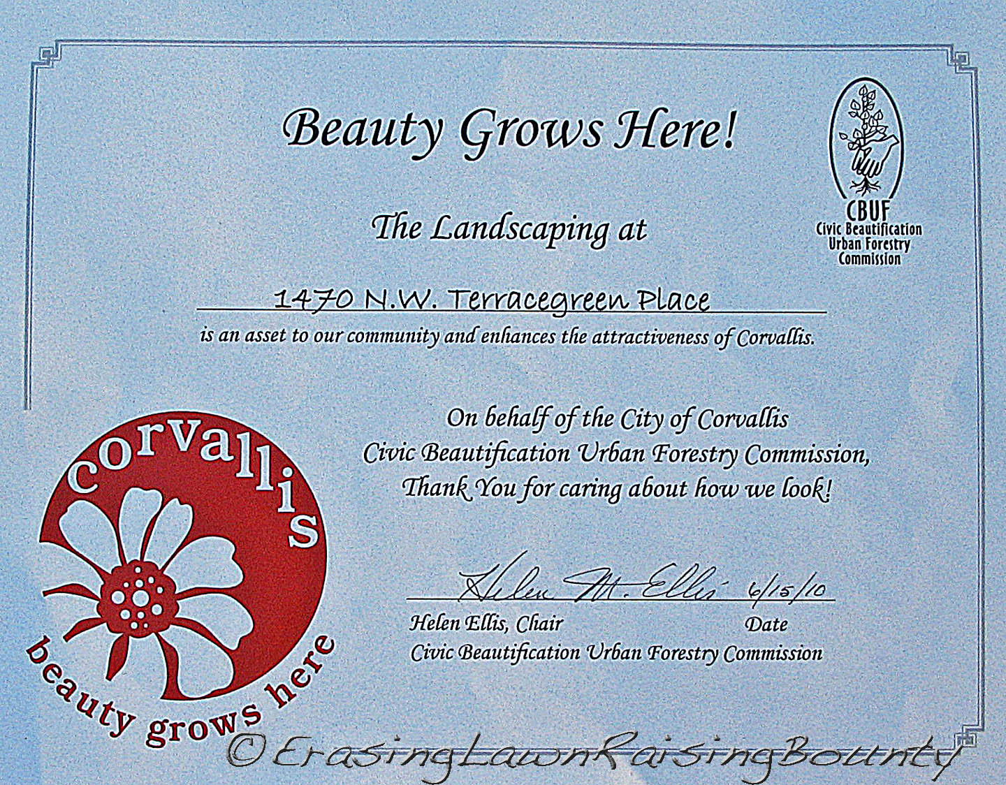 The CG was just granted “Corvallis Beauty Grows Here” status by the Civic Beautification Urban Forestry Commission. Actually, it was awarded in mid-June, but it was a surprise for me just this last week when a commission member stopped by with a certificate.
