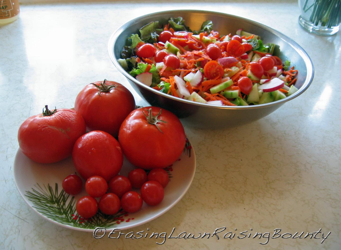 Some actual ripe tomatoes have made their appearance, finally, having been discovered hiding under lush vegetation (now further cut back).  Fourteen pounds of ripe tomatoes, and 20 pounds of thinned back greenies and blushers in the last week is a definite improvement!