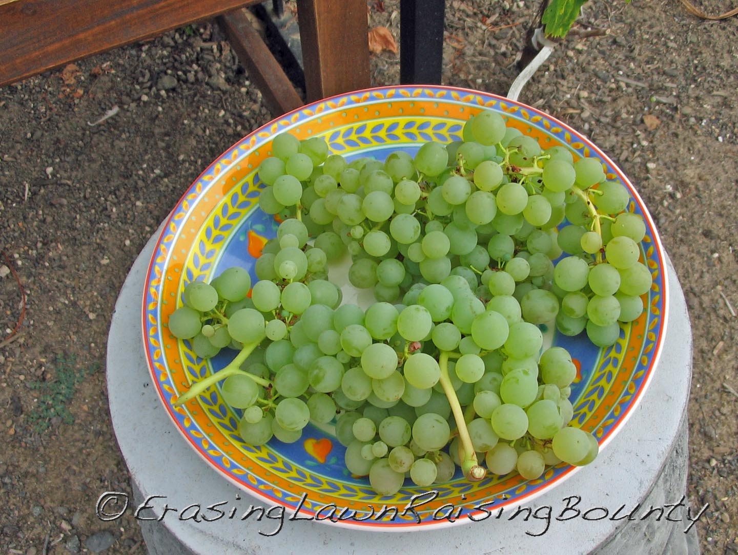 A nice picking of 5 large clusters of ‘Lakemont’ green seedless grapes from my second-year-ling has been a delightful surprise, and very tasty.  A good cultivar given the shiftier weather and less warmth needed to raise sugar content.  Looking forward to more next year!