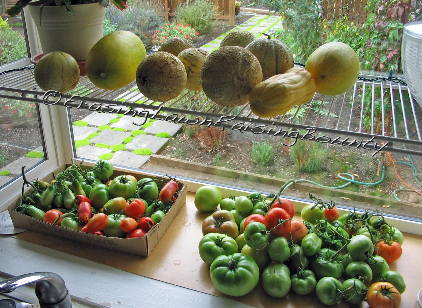 The typical way we keep the squash, melon, and tomato harvest aired and dry during the mild, not-too-rainy days of fall….stored under my eaves.